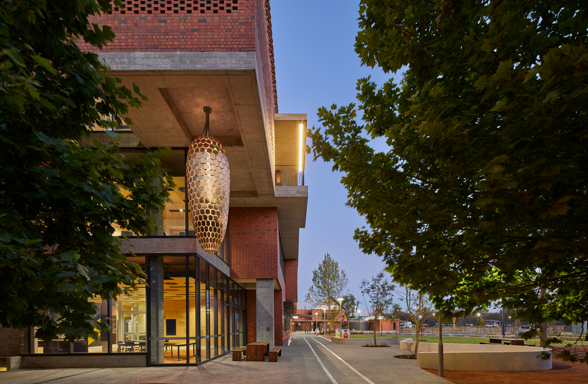 Designed by Lyons with Silver Thomas Hanley, this new brick-brise soleil building marks the first of the new Midland campus, thoughtfully designed from the site’s rich indigenous and industrial context, and for the wellbeing of its occupants.