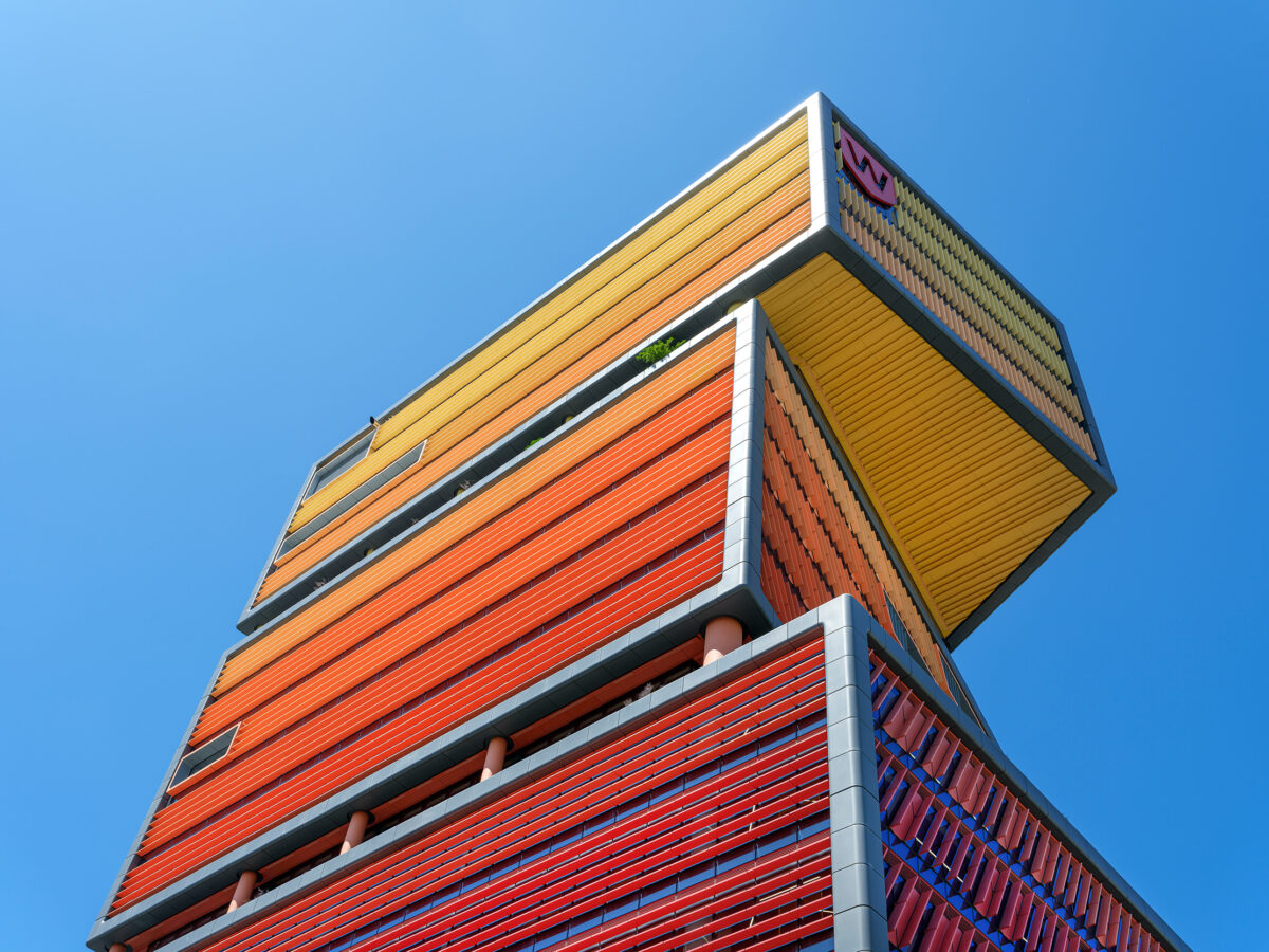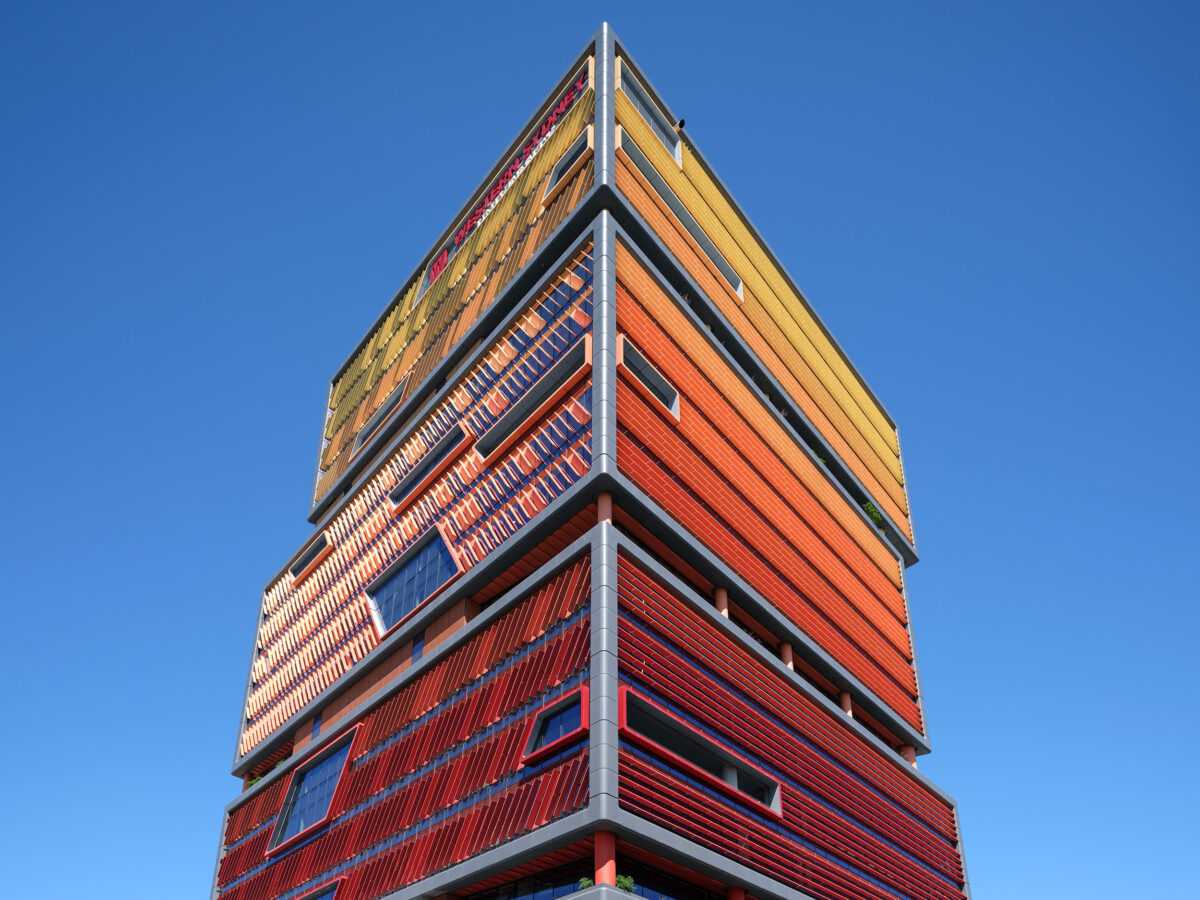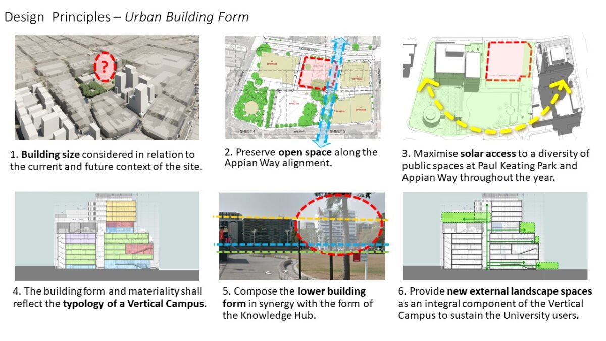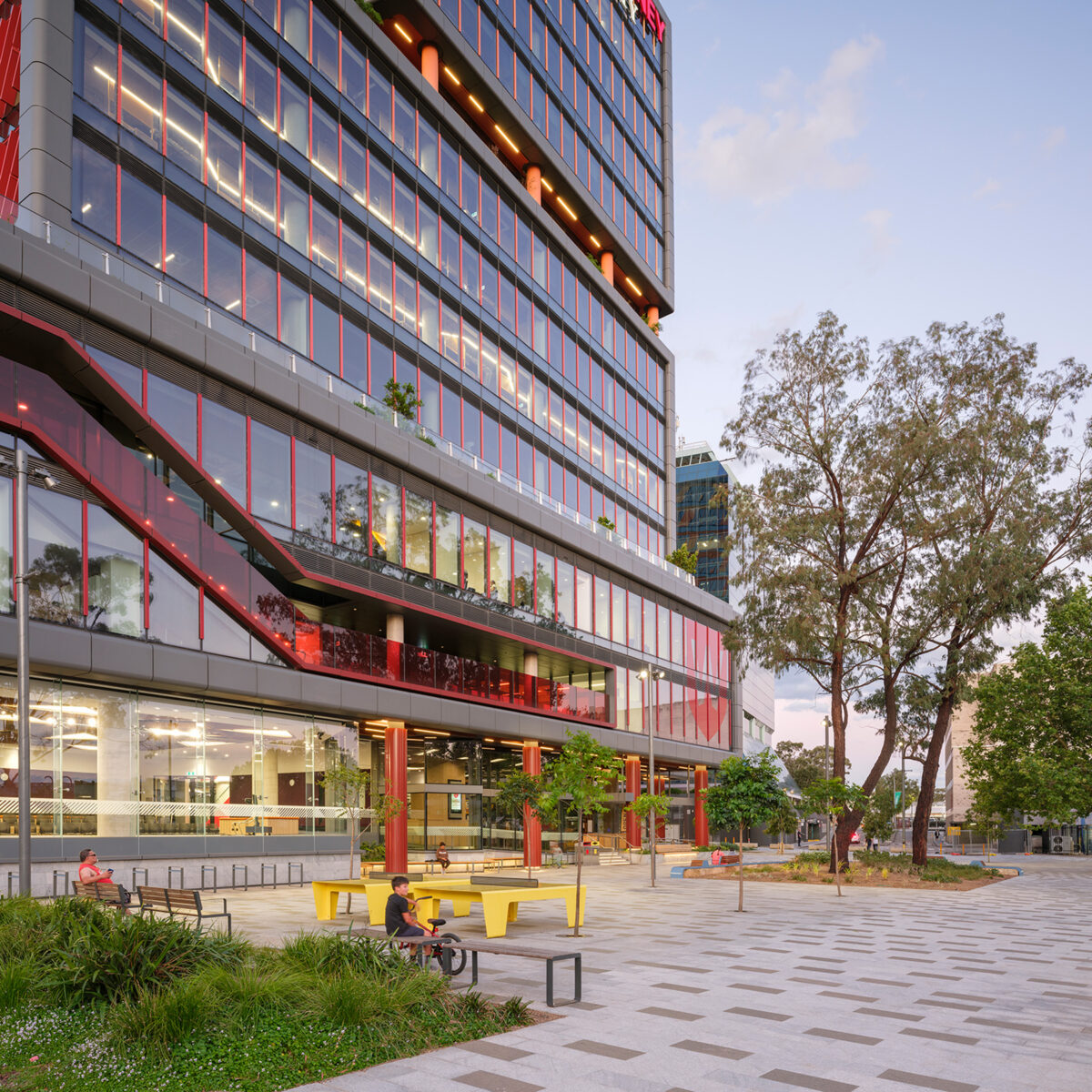 The campus resembles a literal block and stack design, with strategic breaks, step back and rotations in the building form designed in response to the site and to maximise specific areas of solar access. The ground floor design emulates a university street with direct connection between main roads and nearby parks. The building is porous with active street frontages, clear sightlines and height differences used to strengthen wayfinding and connect the building to the street. Clear wayfinding and a permeable ground plane make moving through the building intuitive from street to sky.