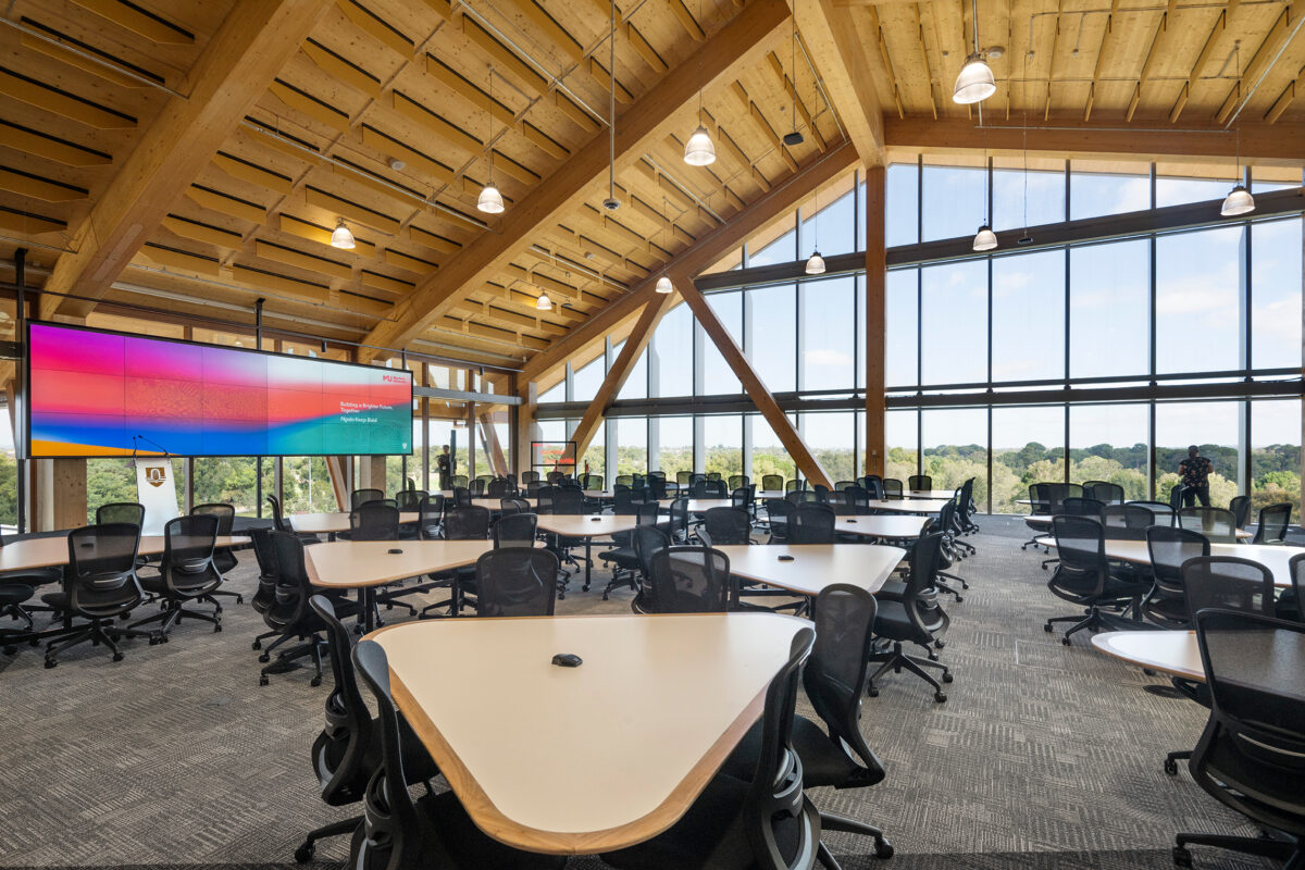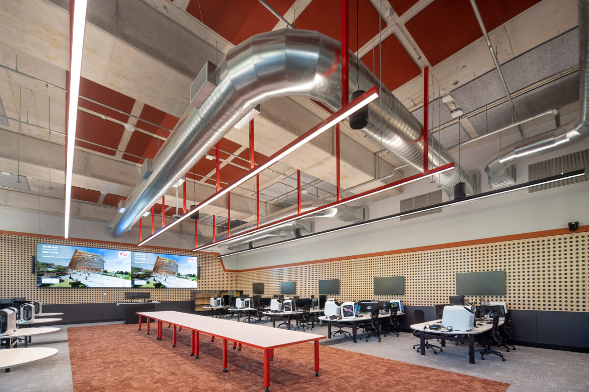 We developed a spectrum of learning spaces to support a range of delivery pedagogies, including collaborative, tech-enabled, experimental and digital immersive learning. The building includes immersive industry collaboration facilities such as augmented reality and artificial intelligence studios to allow students to interact with industry and learn skills that tackle real world scenarios. This variety aligns with contemporary university architecture trends, improving utilisation across timetabled and informal learning.