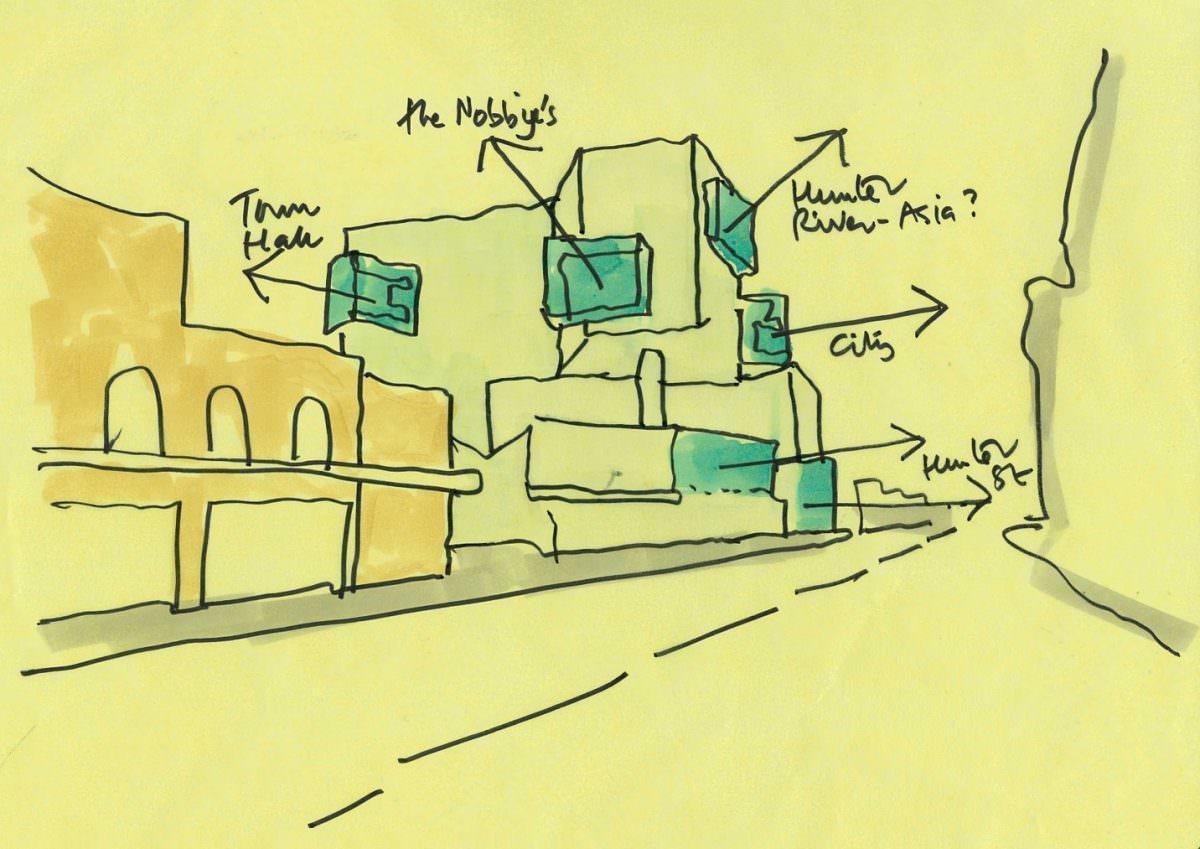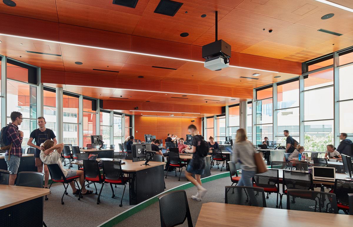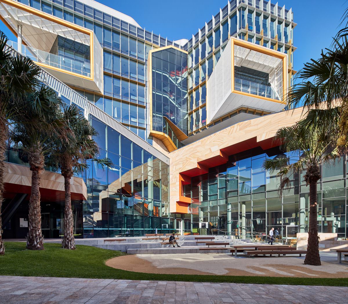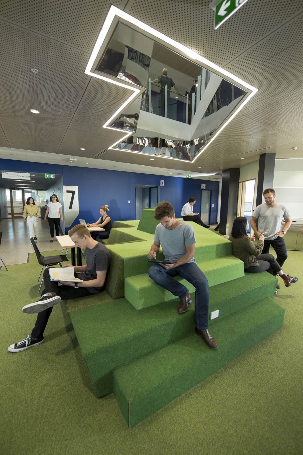 The NUspace campus gives The University of Newcastle an important civic identity. In contrast to the natural bush setting of the Callaghan Campus, our design for NUspace is vibrant and urban while maintaining organic qualities, like sandstone that are familiar to The University of Newcastle. The 9 level vertical campus houses new generation learning spaces, informal social and study seating, accommodation for staff and vibrant public spaces. These materials carry from the public canopy into teaching floors, creating a consistent material language from street to seminar. The project represents a great gathering space in the heart of the city, bringing together city life within a vibrant campus while creating spaces for students and academics to collaborate. The concept of an open university campus is reinforced internally by vertical interconnectivity through the building via escalators, lifts and open stairs. Escalators stitch a sequence of student ‘portals’ and collaborative rooms, encouraging dwell rather than point-to-point travel across the vertical campus. The lower level urban form references and aligns with the adjacent historical buildings, while with an ‘eroded’ canopy of sandstone, the external form is extruded inside in a warm acoustic plywood material. At the corner, the eroded canopy forms an outdoor room for gatherings and events, keeping the edge lively throughout the day.