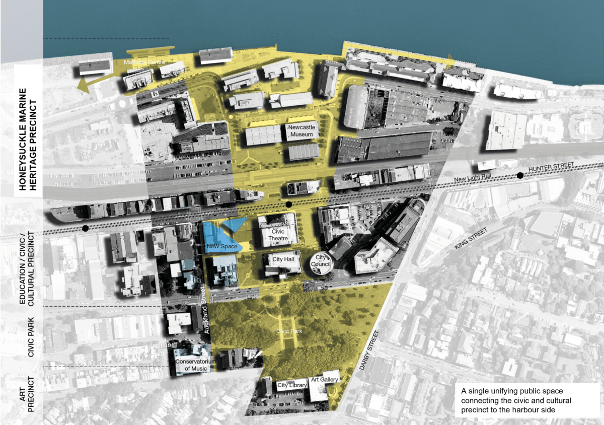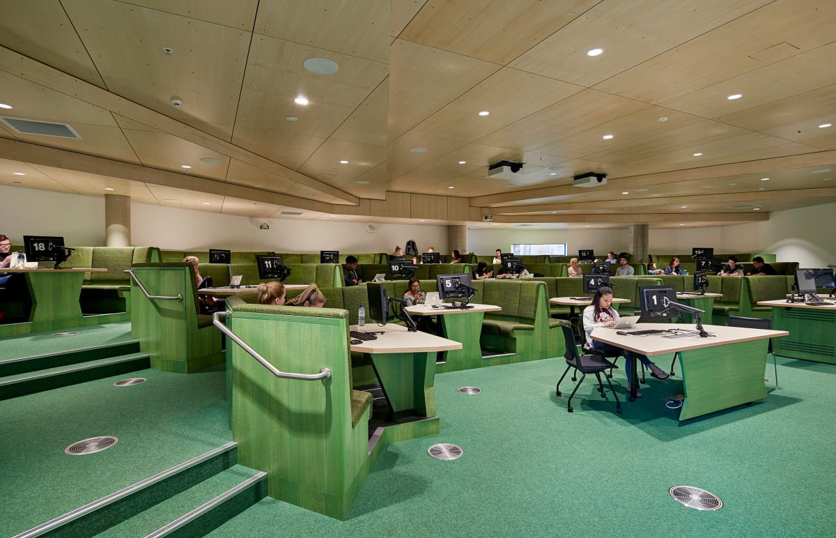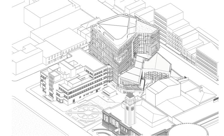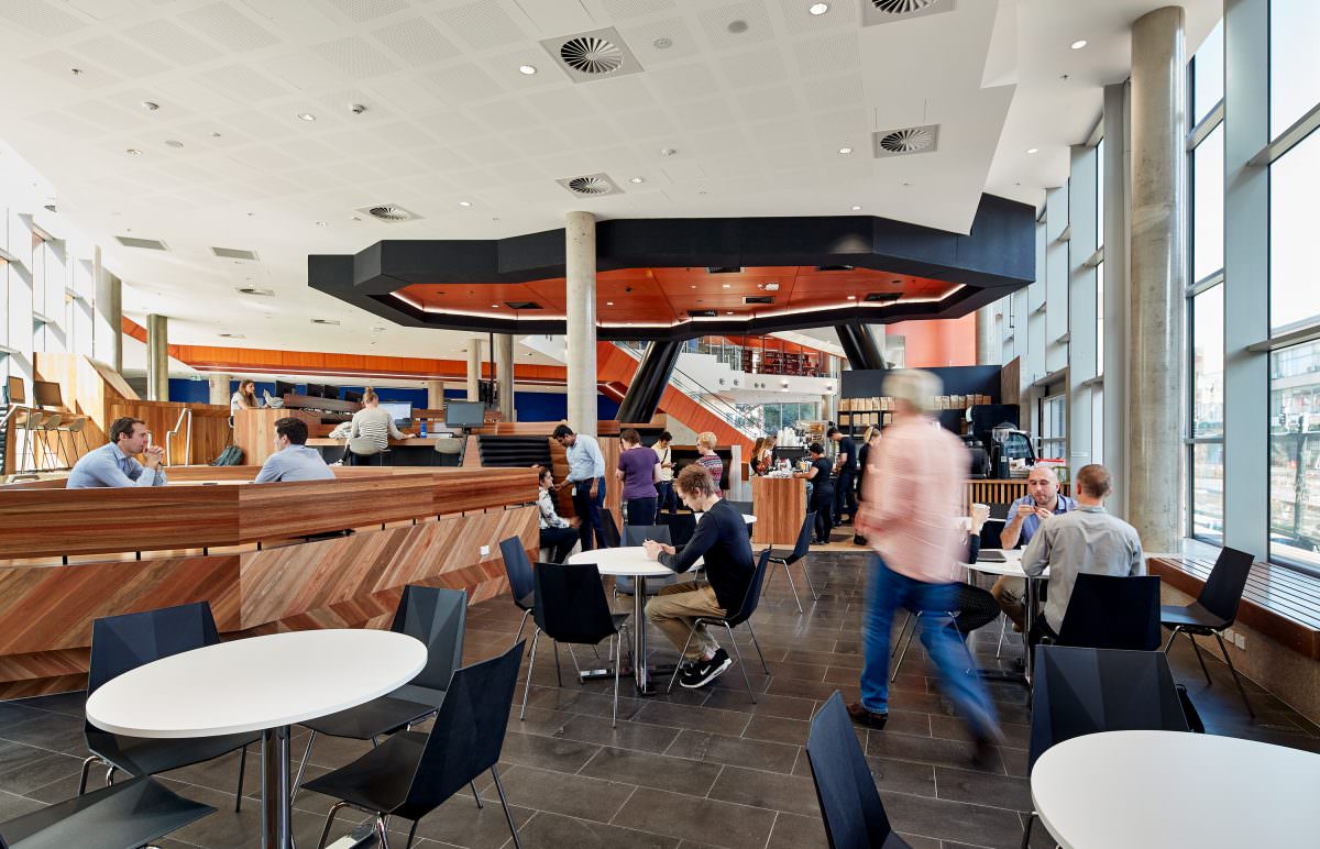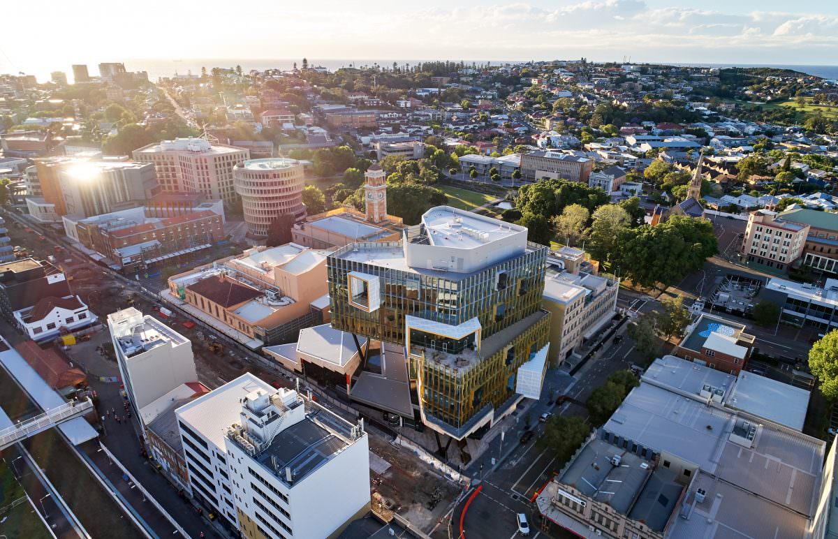 The NUspace campus gives The University of Newcastle an important civic identity. In contrast to the natural bush setting of the Callaghan Campus, our design for NUspace is vibrant and urban while maintaining organic qualities, like sandstone that are familiar to The University of Newcastle. The 9 level vertical campus houses new generation learning spaces, informal social and study seating, accommodation for staff and vibrant public spaces. These materials carry from the public canopy into teaching floors, creating a consistent material language from street to seminar. The project represents a great gathering space in the heart of the city, bringing together city life within a vibrant campus while creating spaces for students and academics to collaborate. The concept of an open university campus is reinforced internally by vertical interconnectivity through the building via escalators, lifts and open stairs. Escalators stitch a sequence of student ‘portals’ and collaborative rooms, encouraging dwell rather than point-to-point travel across the vertical campus. The lower level urban form references and aligns with the adjacent historical buildings, while with an ‘eroded’ canopy of sandstone, the external form is extruded inside in a warm acoustic plywood material. At the corner, the eroded canopy forms an outdoor room for gatherings and events, keeping the edge lively throughout the day.