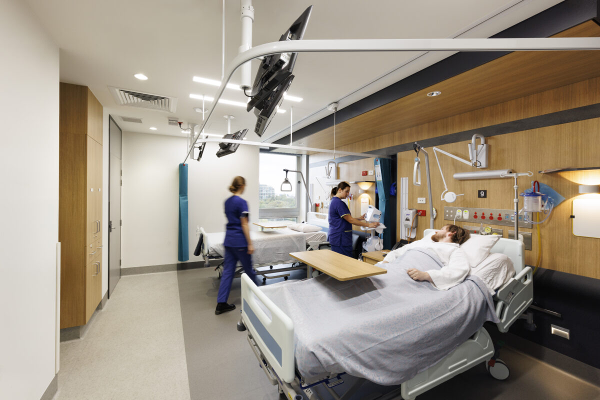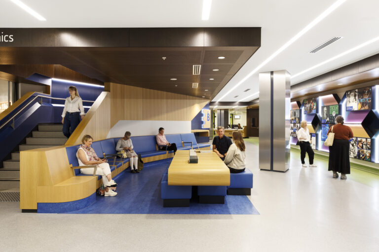 Across the hospital, spaces have been broken down into smaller more identifiable areas. The two main wings remain as a key external visual for the hospital. A new central heart to the hospital site is introduced with a five-story infill building between the wings, completing a U-shaped design that allows efficient connection between all buildings on the campus. The infill supports clinical space planning with direct links across floors. Patient clinical services have been consolidated on the lower three floors of the building for ease of access while training and research facilities are located on the upper levels. The main foyers have been designed to help with orientation, identification, and mapping. Wayfinding aids include screen technologies, Bluetooth activated information access points for web-based media content including GPS wayfinding information and audio messages for the visually impaired. This consolidation supports healthcare efficiency and clearer clinical adjacencies.