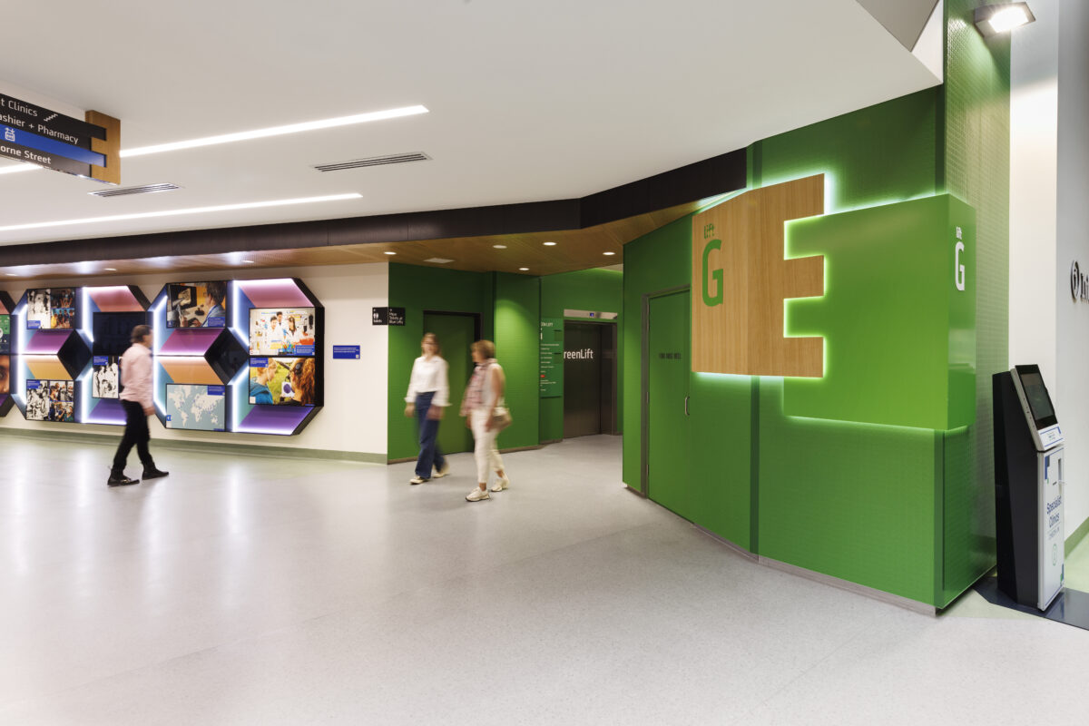 A key focus of the redevelopment of The Royal Victorian Eye and Ear Hospital (RVEEH) is the improvement of navigation and connection between the hospital towers. Hospitals can already be large and complex places to navigate, and it was important to ensure a clear and holistic approach to wayfinding to ensure that navigation did not become more difficult. To avoid this, we implemented a clear master plan that considered the existing structures and how they integrate with the new and refurbished spaces. The strategy draws on VHBA guidelines for clarity, accessibility and universal design.
