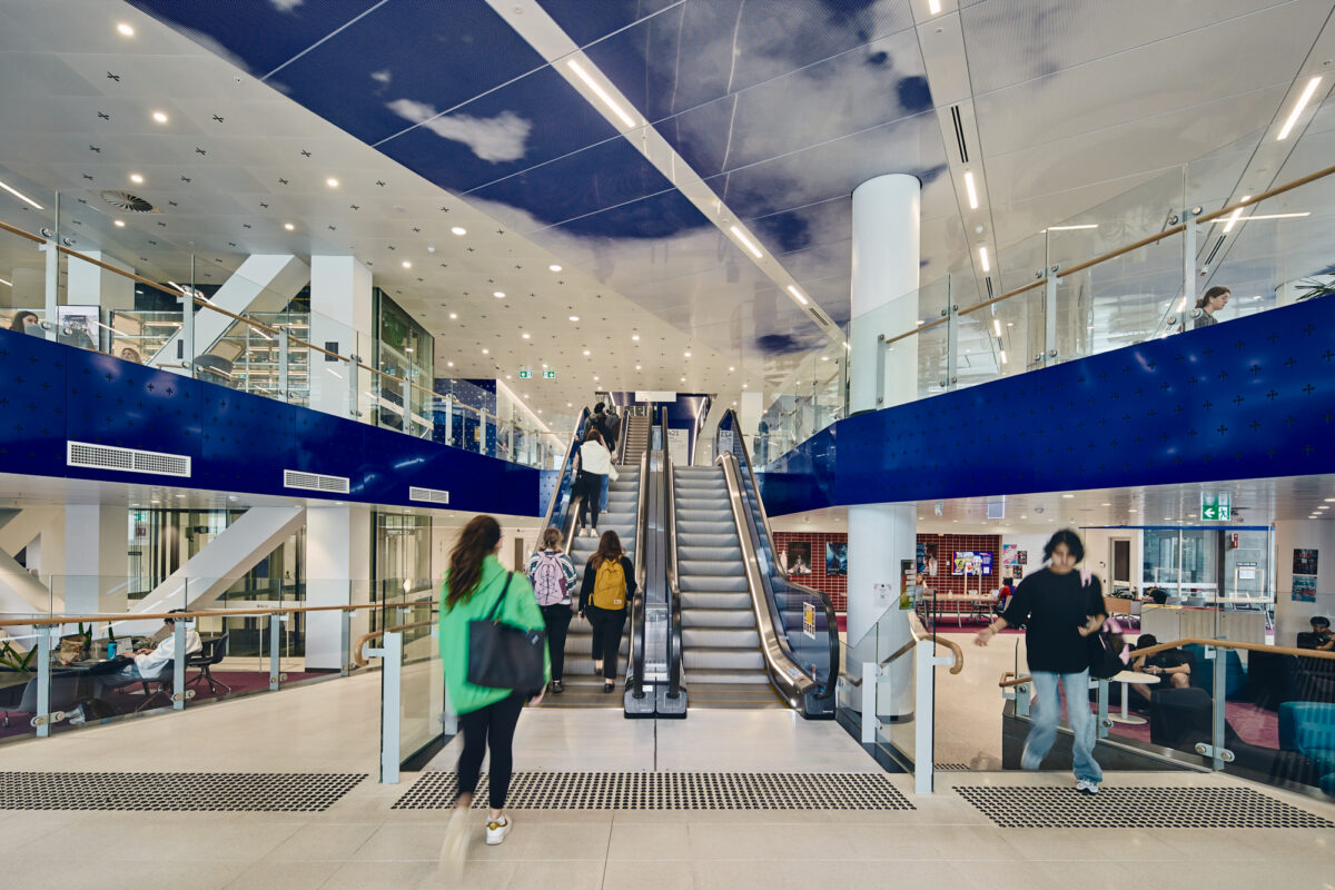The state-of-the-art vertical campus encourages cross facility use with internal and external spaces for recreation and socialisation. Terraces, an urban amphitheatre and the rooftop court are deliberately stacked so recreation, support and study sit in one connected sequence. Our architectural solution responds to the needs of students, teachers and researchers and prioritises flexibility to meet the rapidly evolving needs of university education now and well into the future. Located on the fringe of Melbourne’s CBD and the suburb of Fitzroy, the new Saint Teresa of Kolkata building will anchor and breathe new life into the ACU St. Patrick’s Campus.