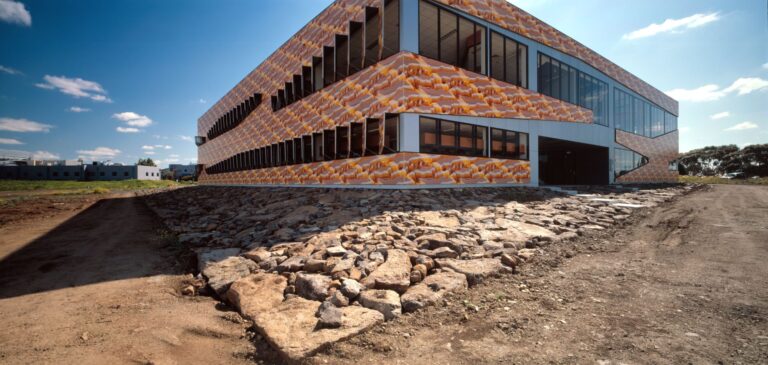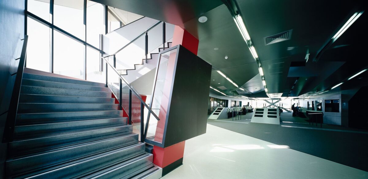 Completed in 2001, our design for the Online Training Facility is one of many projects that focuses on evolving the teaching type by integrating flexible learning spaces and transforming campuses into active, student-focused environments. While the exterior of the building is visually striking, the interior is equally a product of in-depth intellectual investigations. The design not only challenges conventions of the teaching and learning environment, but specifically in computer and multimedia studies. Planning creates academic collaboration areas alongside the computer precinct, supporting project-based learning and staff-student exchange.